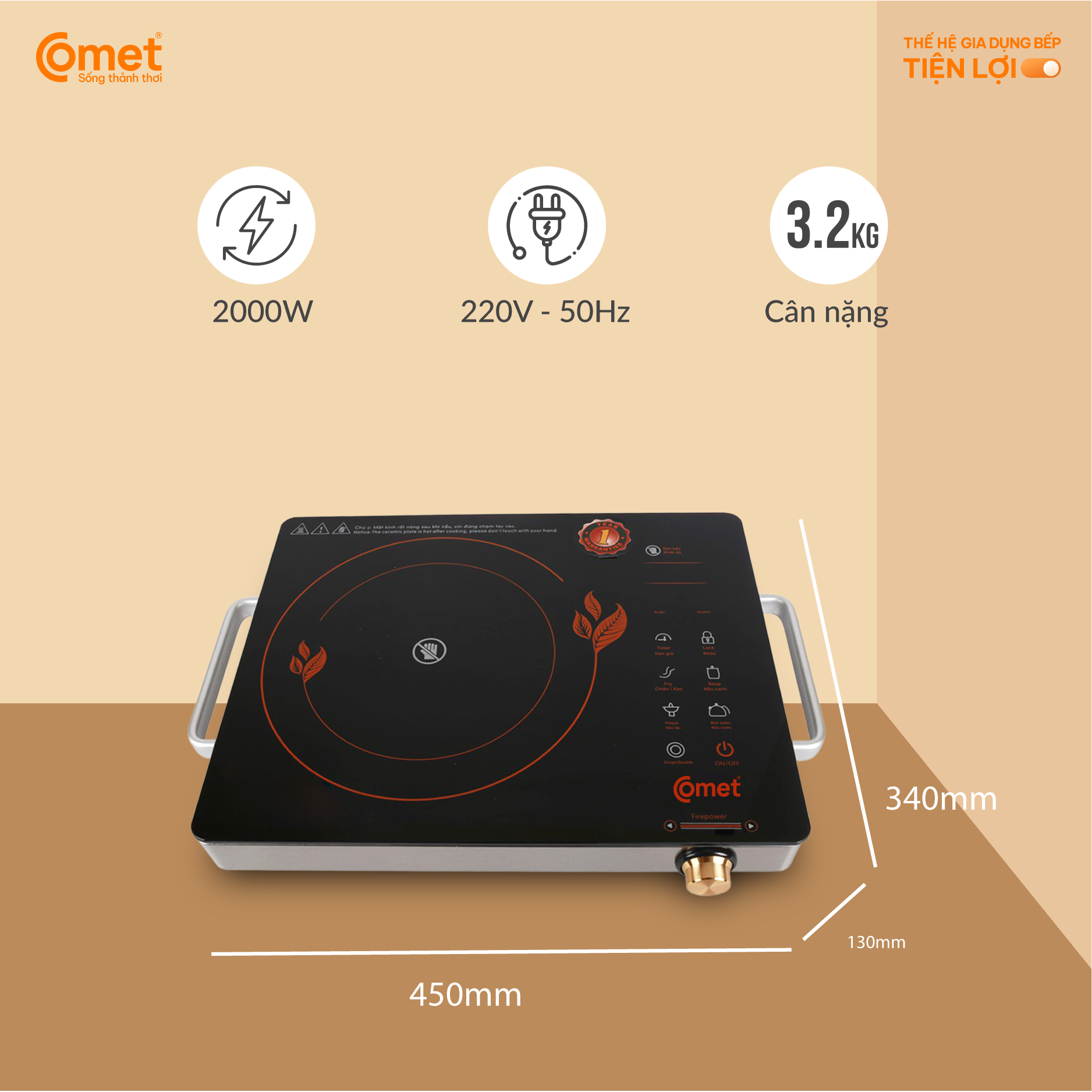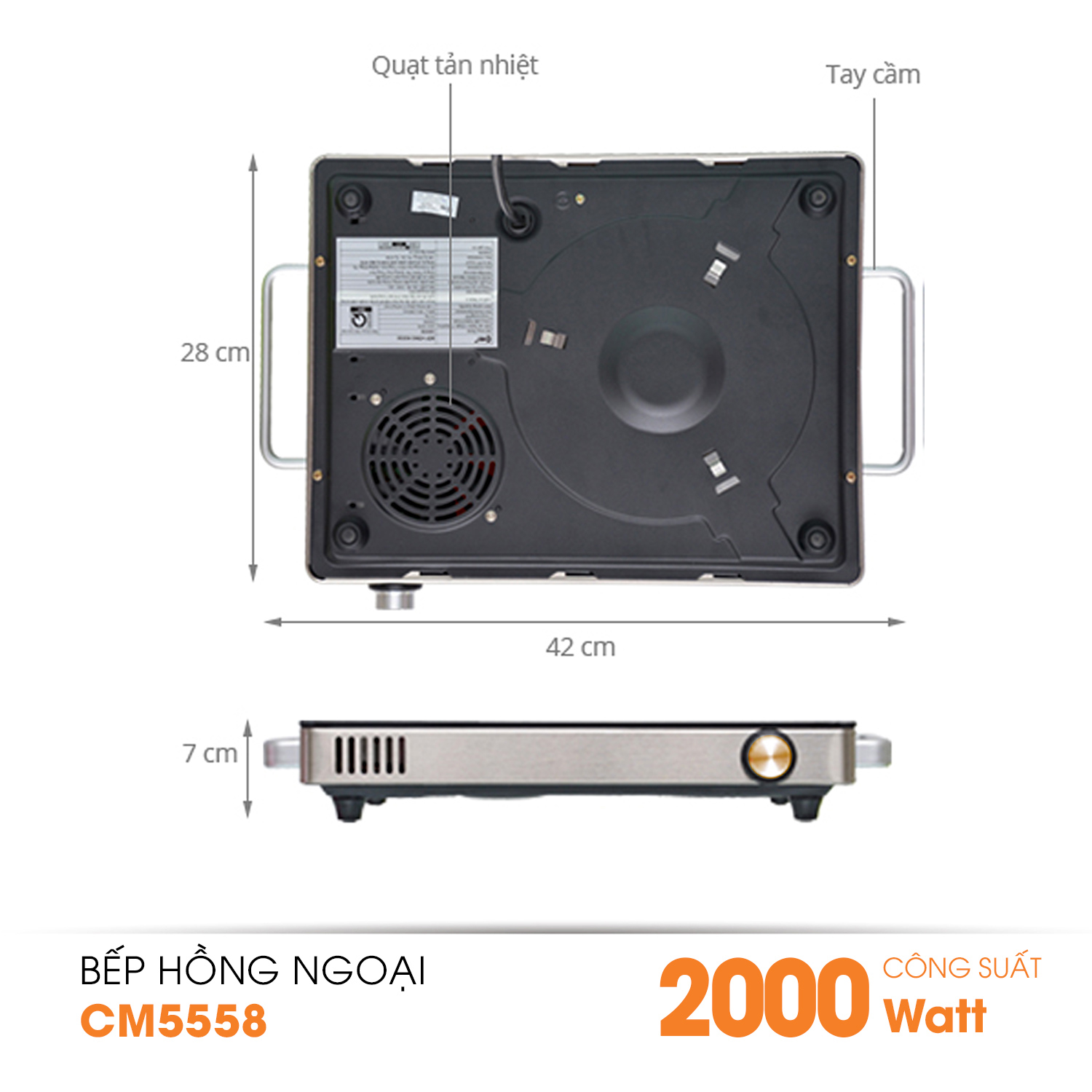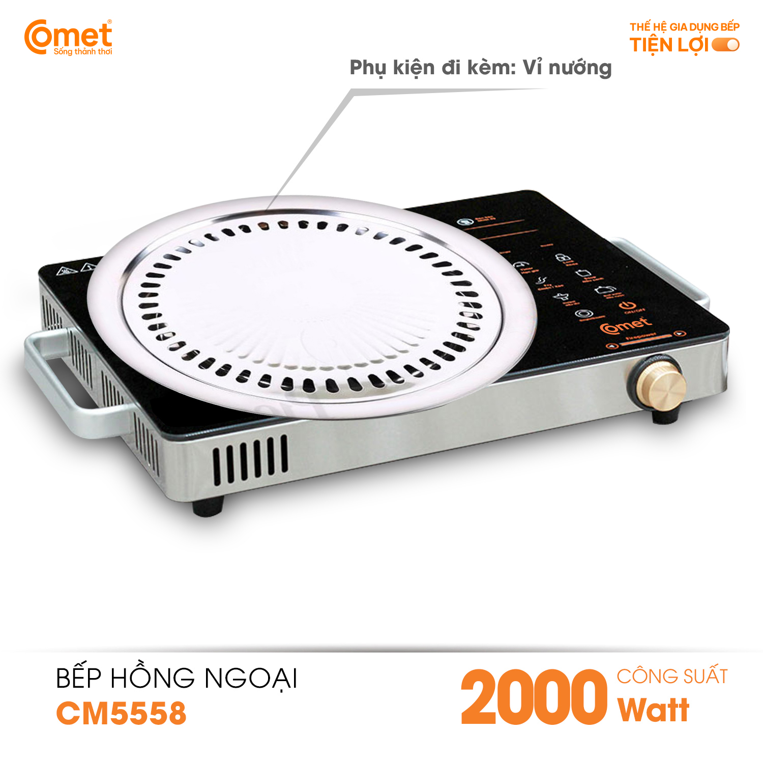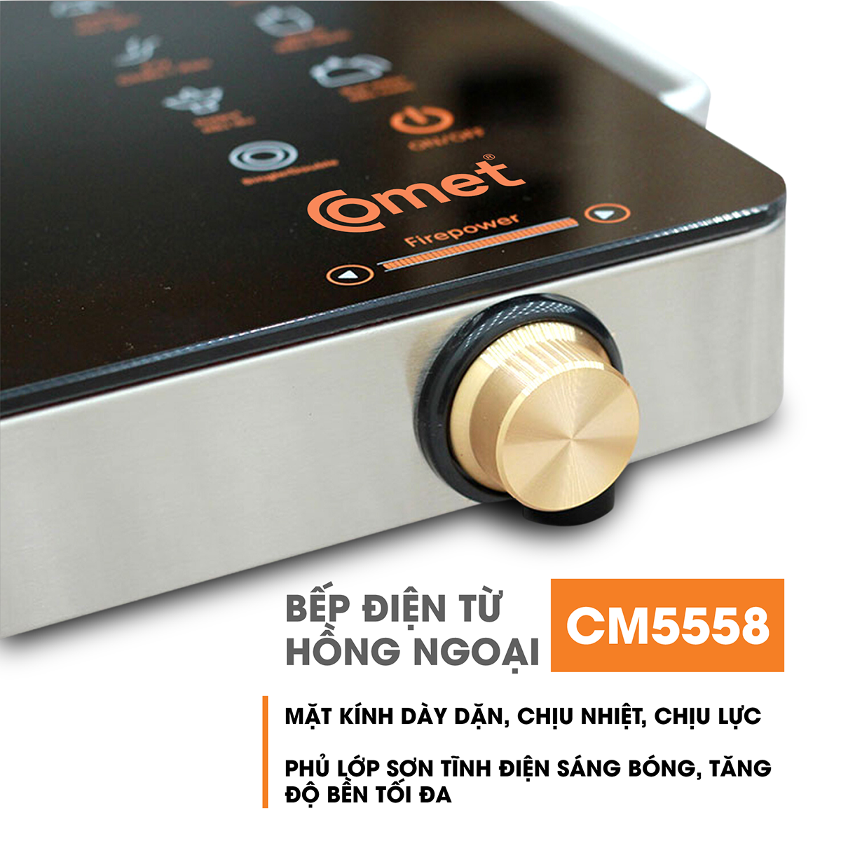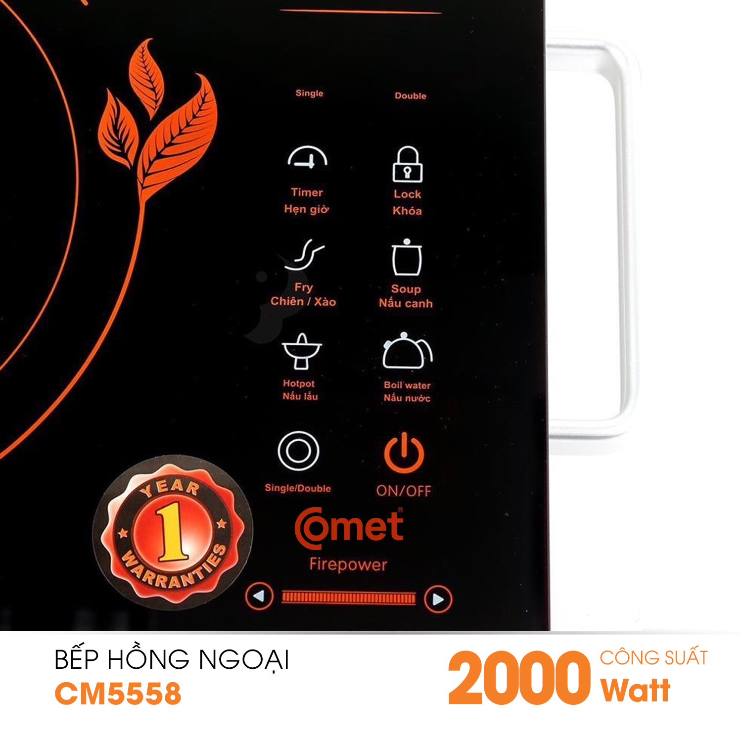 Bếp hồng ngoại Comet CM5558 công suất 2000W hoạt động bền bỉ, sản phẩm có chất liệu hoàn toàn cao cấp với mặt kính dày dạn, chịu nhiệt, chịu lực và có khả năng chống trầy xước, va đập cực cao. Bề ngoài của bếp được phủ một lớp sơn tĩnh điện không những mang lại vẻ đẹp sáng bóng mà còn giúp cho sản phẩm luôn có được độ bền tối đa theo thời gian sử dụng.