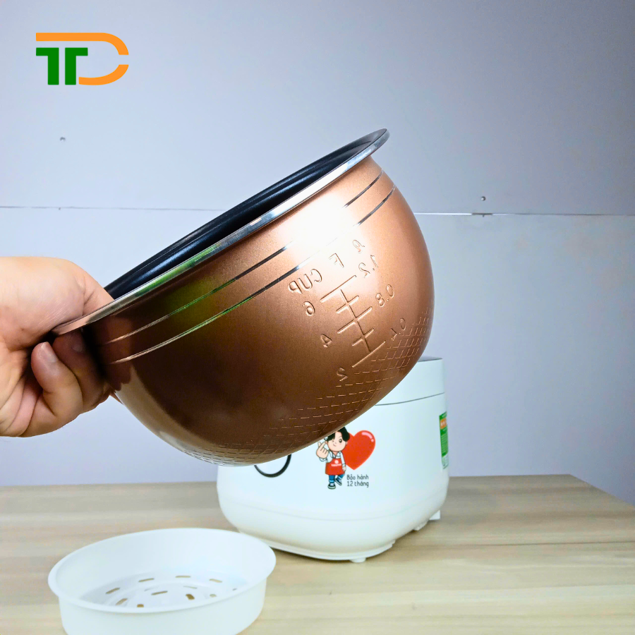 Lòng nồi cơm điện được làm từ hợp kim nhôm phủ chống dính, dẫn nhiệt tốt, giúp nấu cơm chín đều và nhanh chóng, tiết kiệm điện năng. Lớp chống dính an toàn cho sức khỏe, chống trầy xước, hạn chế dính cháy, cọ rửa vệ sinh sạch sẽ.